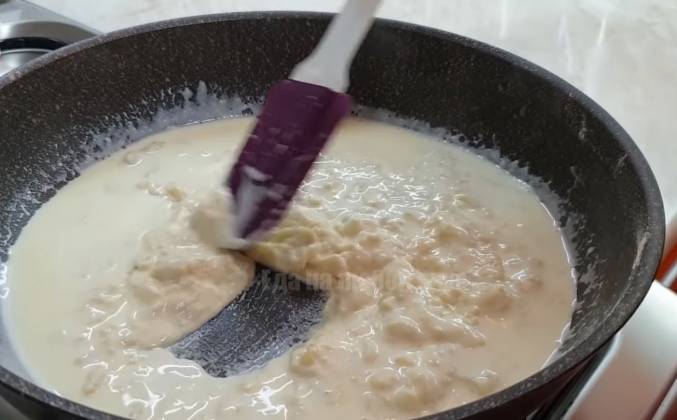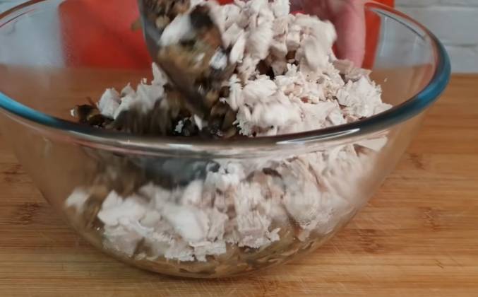 2. Грибы начнут выделять сок, чтобы ее не потерять готовим их под крышкой 10-15 минут. Готовое мясо достаем, даем ему немного остыть. Грибы остаются сочными, перекладываем их в миску. Куриное филе нарезаем на небольшие кусочки, добавляем к грибам, перемешиваем. На разогретой сковороде поджариваем 30 грамм муки. Добавляем 30 грамм сливочного масла, быстро перемешиваем, следом добавляем 150 граммов 10% сметаны, размешиваем, разбивая все комочки. Соус будет густым. Не забываем посолить и поперчить.