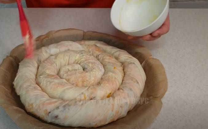 4. Выпекаем при температуре 180-190 градусов в течение одного часа. За 10-15 минут до готовности, смешиваем желток с половиной чайной ложки сметаны, смазываем пирог и быстро возвращаем в духовку, чтобы он приобрёл глянцевую красивую корочку. Если горит верх, то прикройте пирог фольгой. Готовому пирогу даём остыть, примерно 10 минут накрыв полотенцем. И давайте же скорее посмотрим, что у нас получилось. Слои пропеклись, аромат приятный! Хороший вкус: пресное тесто отлично дополняет начинка из орехов, изюма и тыквы.Видео рецепт ютуб ниже 👇
