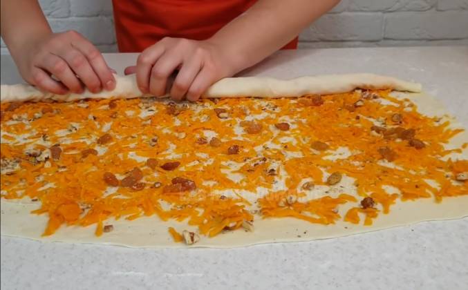 2. Натираем 350 грамм тыквы на крупной терке. Отжать сок, если слишком влажная Грецкие орехи измельчаем в крупную крошку, можно ножом. Тесто полежало 30 минут, стало более эластичным и мягким. Разделим его на две равные части и начнем раскатывать, постоянно подсыпая муку. Раскатать тесто нужно максимально тонко в прямоугольник, чтобы даже стол было видно. Теперь тесто смазываем растопленным сливочным маслом, не слишком много. Посыпаем равномерно грецкими орехами (по 35 г), далее также распределяем половину тыквы. Добавляем изюм примерно (по 40 г). Сверху присыпаем сахаром по вкусу.