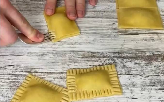 2. Слегка остывший шпинат добавляем в ёмкость с рикоттой и перемешиваем, при этом не забываем посолить нашу начинку. ⠀ Тесто делим на 3 части. Каждую часть раскатываем и разрезаем на 2 длинные и равные полоски. На этих полосках намечаем маленькие прямоугольники и в центр каждого выкладываем начинку. ⠀ Смачиваем края равиоли водой и накрываем второй полоской теста. Выгоняем воздух из равиоли, слегка прижимая верхний пласт теста к нижнему.