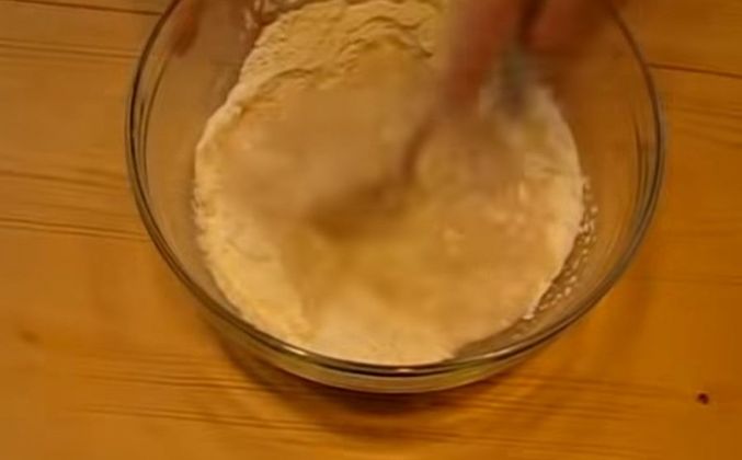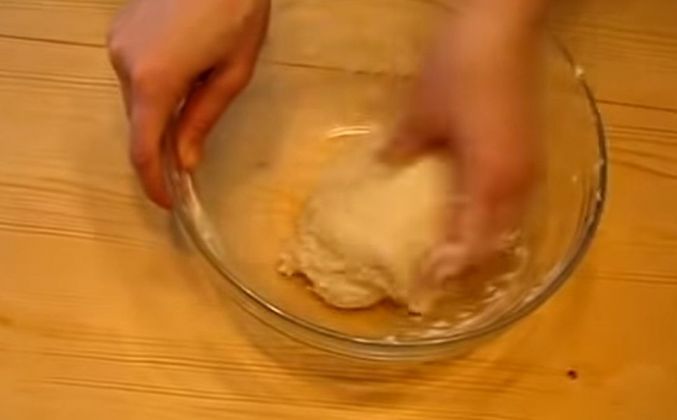 2. В отдельную миску просеиваем муку, добавляем в муку пол чайной ложки соли, размешиваем. Выливаем сюда разведенные дрожжи, замешиваем тесто. Должно получиться такое довольно мягкое тесто, по консистенции, как такое очень мягкое и хлебное тесто.