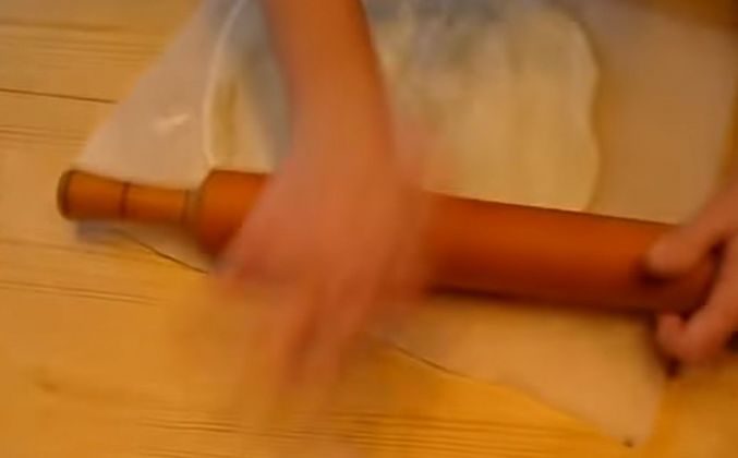 4. Берем бумагу для выпечки по размеру противня. Я бумагу слегка присыпала мукой, и далее выкладываем тесто. Вы его можете просто раскатать скалочкой. Я сначала немножко потяну руками, зачем уже скалкой до нужного размера. В результате, получилась пицца, диаметром примерно 30 сантиметров.
