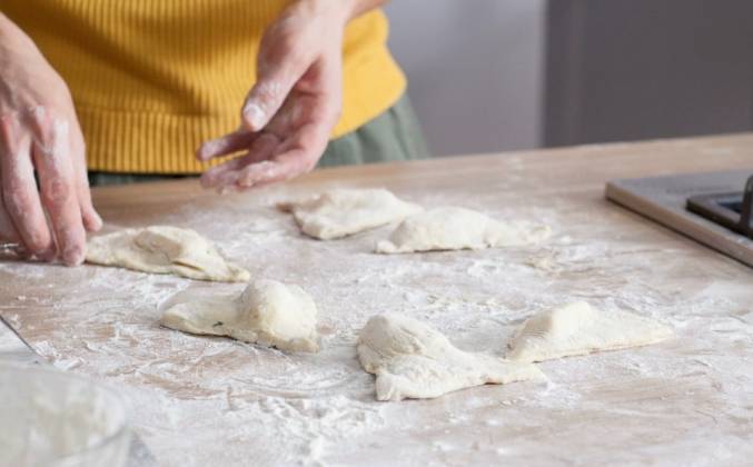 2.  Тесту надо дать остыть в холодильнике 15 – 20 минут, мука набухнет и тесто станет идеальной консистенции. Насыпать 40 г муки на стол и переложить на него тесто, как следует обвалять тесто в муке и разделить на 4 части. Каждый кусочек раскатать в круг (посыпая в процессе мукой, чтобы не прилипало) – составные треугольников, два круга – нижняя часть и два круга – верхняя часть. Моцареллу нарезать средними брусочками. Один круг визуально разделить на 6 ровных треугольников (как пиццу), выложить на каждый предполагаемый треугольник по 1 брусочку сыра.