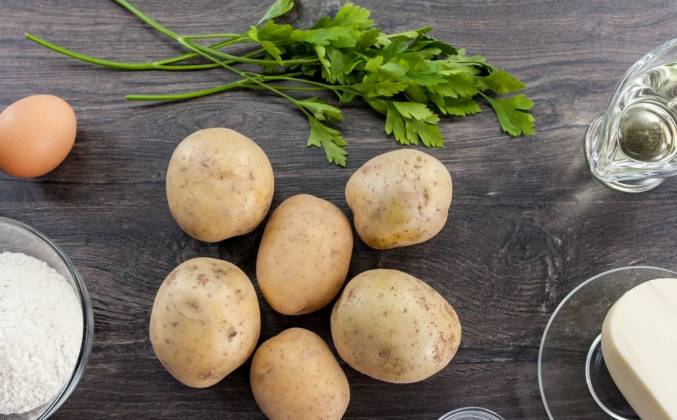 3.  Сверху накрыть ещё одним кругом из теста, скрепить края и прижать промежутки между брусочками сыра, разрезать на 6 треугольников. Таким образом сделать ещё 6 треугольников из оставшихся двух кругов теста и моцареллы. На разогретую сковороду налить 30 мл растительного масла, переложить 6 треугольников, накрыть крышкой и обжарить с двух сторон на минимальном огне (на первой стороне обжаривать дольше). 4.  Готовые треугольники переложить на тарелку с салфетками, чтобы убрать лишнее масло. Затем налить на сковороду 20 мл растительного масла и обжарить ещё 6 треугольников. Сервировка Переложить картофельные треугольники с сыром на порционные тарелки.