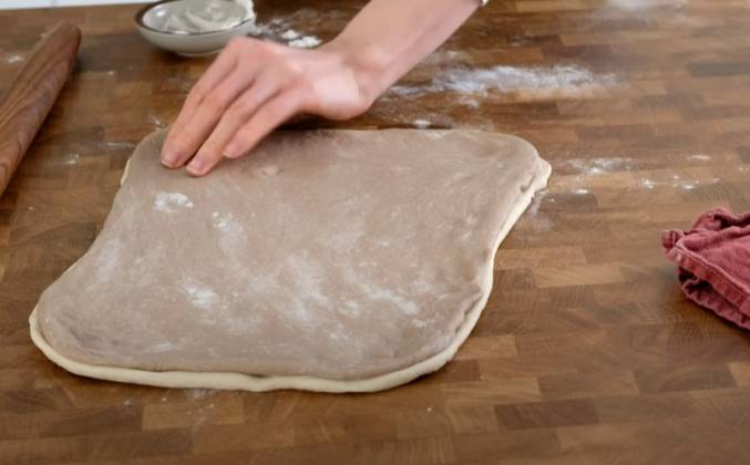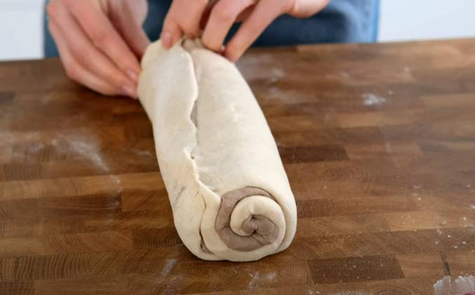 2. Вторую часть теста положите в комбайн или миску. Размешайте какао (10 гр) с водой (15 гр) до однородности. Добавьте к тесту и замесите до однородности. Сформируйте тесто в колобок и также положите в миску на расстойку, при комнатной температуре, на 60-90 минут до увеличения вдвое. Выложите подошедшее тесто на стол и раскатайте оба теста в одинаковые прямоугольнике по ширине чуть больше длины формы. Сложите тесто друг на друга и скатайте в рулет.