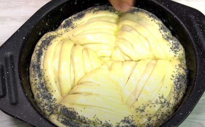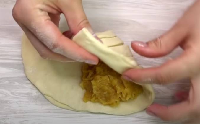 3. Затем накрываем второй половиной прижимаем слегка краешки. на середину кладем начинку, закрываем сначала одной стороной, затем второй, и защипываем, должен получится вот такой треугольник. Берем форму я сегодня буду делать круглый пирог, форму смазываю маслом, у меня форма антипригарная фирмы таллер, можно взять прямоугольную форму и выложить пирог по прямоугольной форме. Или просто запечь как отдельные пирожки. Даем пирогу расстояться минут 10-15 смазываем желтком, край я посыпала маком. Ставим в холодную духовку и выпекаем при 180 градусах 30-40 минут, ориентируетесь по своей духовке. Готовый пирог сразу вынимаем из формы, прикрываем полотенцем и даем ему полностью остыть. Затем подаем к столу.Видео рецепт ютуб ниже 👇