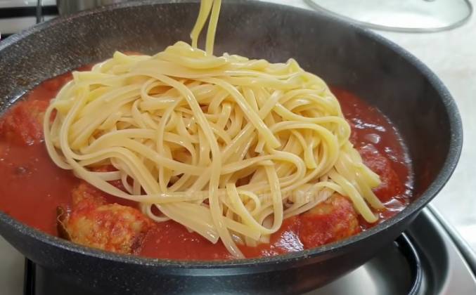 3. Если соуса нет, в воде разводите томатную пасту по вкусу. В закипевший соус опускаем фрикадельки, накрываем крышкой и тушим до готовности минут 20-30. Примерно за 10 минут до готовности отвариваем спагетти согласно инструкции на упаковке. Закипевшую воду солим, опускаем пасту, варим до состояния Al dente, то есть спагетти мягкие сверху, а внутри твердые. Паста готова, фрикадельки к этому времени тоже готовы. Добавляем пасту в сковороду к фрикаделькам. Все аккуратно перемешаем, сверху посыпаем тертым сыром и зеленью.Видео рецепт ютуб ниже 👇