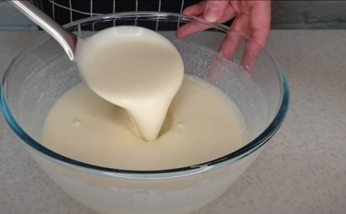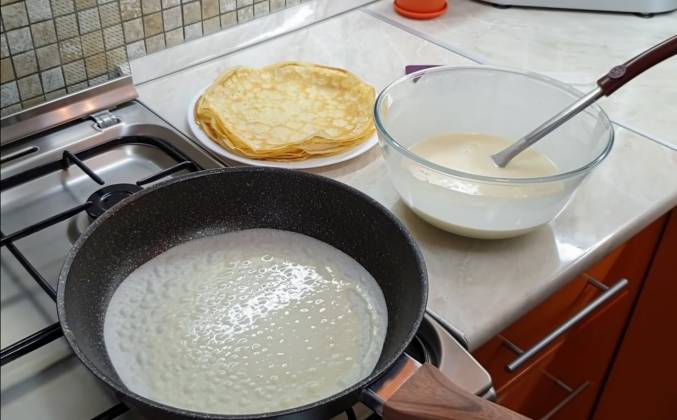 2. Также нам понадобятся жирные сливки, не расстраивайтесь, если сливок у вас нет. Вы можете использовать жирное молоко плюс примерно где-то 70 грамм растопленного сливочного масла. Тесто снова размешиваем и в конце добавляем растительное масло. В итоге вот такой густоты оно должно у нас получится, запомните чем жиже тесто, тем тоньше блины, но и слишком жидким как вода оно тоже не должно быть. Блинное тесто оставляем при комнатной температуре на 30 минут. Можно убрать в холодильник на один час, а хотите оставьте должна ночь, блины будут только вкуснее Разогреваем сковороду с толстым дном, если требуется то слегка смазываем растительным маслом.