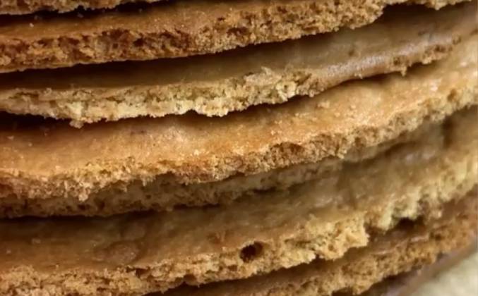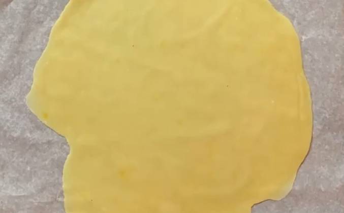 2. Тесто остынет и станет пластичным, почти не липким. Присыпать стол мукой, разделить тесто на 8 равных частей, накрыть их плёнкой. ⠀ Раскатывать по одному ОЧЕНЬ ТОНКО! Удобно работать на тефлоновом коврике или между двумя слоями бумаги для выпечки. Наколоть вилкой. ⠀ Выпекать в разогретой заранее до 190 градусов духовке буквально 3-5 минут- до румяности. Достать и тут же обрезать по форме (у меня дно от разъёмной формы 20 см в d).