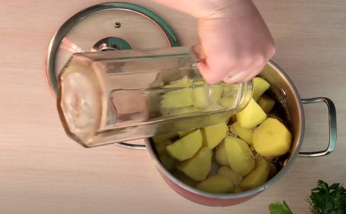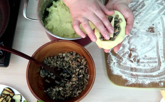 2. В конце добавляем натертый на мелкой терке чеснок. Остужаем. С картофеля сливаем воду и толчем, оставляем пока пюре полностью не остынет. Сыр нарезаем небольшими пластинками. В остывшее картофельное пюре разбиваем одно яйцо, перемешиваем. Всыпаем пол стакана муки и перемешиваем до однородного состояния. Разделочную доску посыпаем мукой, руки смазываем растительным маслом, чтобы не прилипало картофельное тесто.