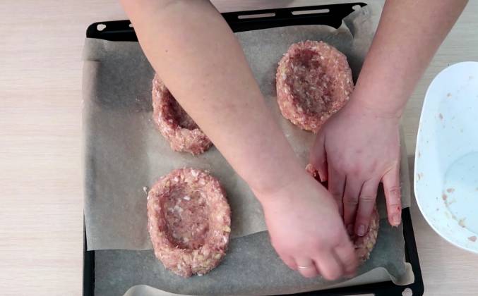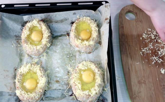 2. Фарш делим на четыре части, из каждой формируем лодочку с углублением по середине. Выемка должна быть достаточно глубокой, чтобы можно было разбить в нее яйцо. Выкладываем шницели на противень, застеленный пергаментной бумагой. Ставим в предварительно разогретую до 180 градусов духовку на 30 минут. 80 грамм твердого сыра натираем на мелкой терке. Достаем шницель из духовки и посыпаем большей частью сыра, в углубление много сыра насыпать не нужно.