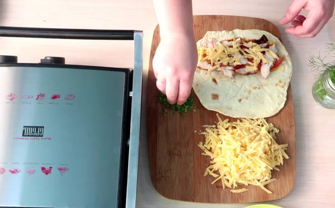 4. Куриное филе нарезаем полосочками. На крупной терке трем твердый сыр. Мелко нарезаем зелень. Ставим гриль разогреваться, на край тортильи выкладываем сладкий перец, острый соус, дольки помидора, мясо, посыпаем тертым сыром и зеленью. Накрываем вторым краем. Обжариваем тако на гриле до хрустящей корочки, сыр должен расплавиться, а на лепешки появиться вот такие полоски. Вкусные тако с курицей и овощами в самодельных тортильях подаем на стол.Видео рецепт ютуб ниже 👇