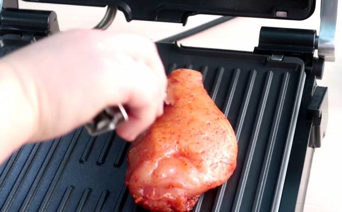 2. Выливаем остывший жир, перемешиваем тесто, можно перетереть руками, чтобы получились маленькие комочки. Наливаем 120 мл холодной воды, перемешиваем и выкладываем на посыпанный мукой стол, подсыпая помаленьку муку, замешиваем тесто. Получается вот такое мягкое, эластичное тесто. Кладем его в полиэтиленовый мешок и оставляем при комнатной температуре на 30 минут. Теперь обжарим замаринованное куриное филе на гриле. Гриль нагреваем до максимальной температуры, как только гриль нагреется, погаснет зеленая лампочка.