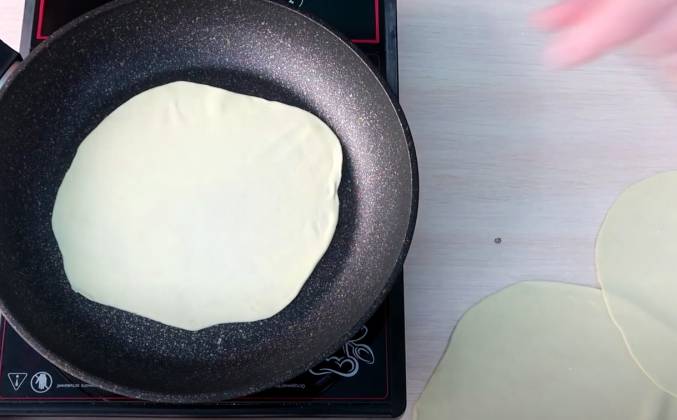 3. Кладем мясо, накрываем и запекаем 15 минут, получаются вот такие красивые полосочки. Убираем филе и остужаем. Стол посыпаем мукой, тесто обминаем и делим на 8 частей. Каждую раскатываем в тонкую лепешку диаметром 20 см. Жарим тортильи на сухой, хорошо разогретой сковороде с двух сторон. Готовые складываем на тарелку и сверху накрываем второй тарелкой или полотенцем, чтобы лепешки не засыхали. Сладкий перец разрезаем, убираем семена и нарезаем соломкой. Помидор нарезаем полукольцами.