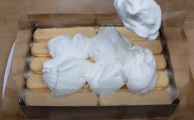 3. Пропитаем печенье в сливках Погружаем печенье в сливки, пару раз печенье переворачиваем и даём сливкам стечь Выкладываем печенье в один слой на тарелку. Я использую готовое печенье Savoiardi - это воздушное бисквитное печенье. Такое печенье вы можете приготовить сами, ссылку на рецепт, как приготовить печенье Savoiardi, я оставлю в описании под видео и в подсказках к видео. При желании печенье можно заменить просто бисквитом. Устанавливаем разъёмную форму и ацетатную плёнку. Если формы нет, то крем можно выкладывать при помощи кондитерского мешка. Или сформировать торт в глубокой чаше, по типу десерта Tiramisu.