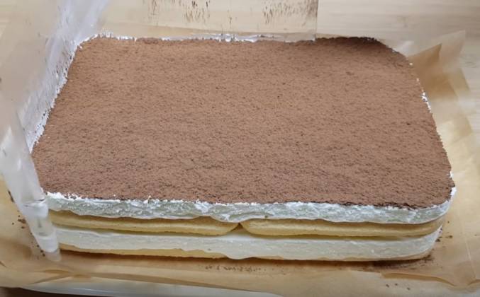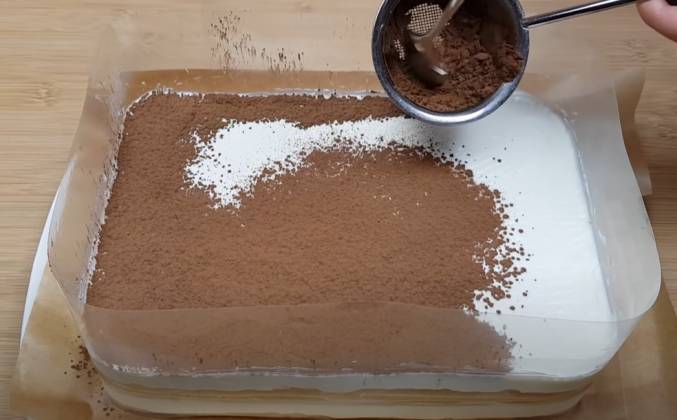 4. Выкладываем половину крема на печенья и равномерно разравниваем. На крем выкладываем одним слоем пропитанное в сливках печенья. Печенья покрываем оставшимся кремом. Накрываем торт пищевой плёнкой. И убираем в холодильник, чтобы он пропитался и стабилизировался, на 5-6 часов, я обычно убираю на ночь. Готовый торт освобождаем от формы Сверху торт посыпаем просеянным какао. Торт готов, снимаем ацетатную плёнку И убираем пергаментную бумагу.