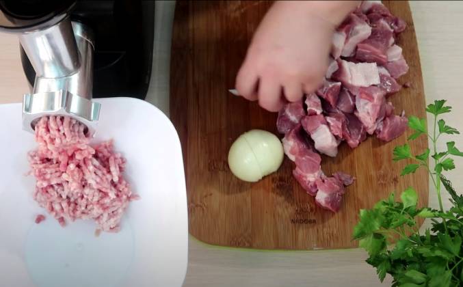 2. Пока грибы остывают, приготовим фарш, мясо нарезаем небольшими кусочками, луковицу разрезаем на 4 части. Перекручиваем через мелкую решётку мясорубки. 200 грамм булгура замачиваем в холодной воде на 2 часа. Промываем и откидываем на дуршлаг, чтобы сбежала вся вода. Перекладываем булгур в фарш и хорошо перемешиваем. Еще раз пропускаем через мелкую решетку мясорубки. Солим и перчим по вкусу, перемешиваем руками до вязкого состояния. Сыр нарезаем тонкими пластинками. Кеббе можно приготовить при помощи специальной насадки на мясорубке, а можно и формировать их руками.