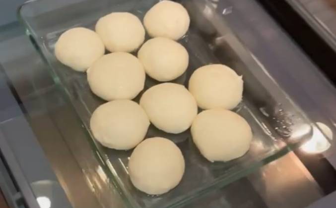 2. Итого замешиваем тесто 10 минут примерно. Конечно очень удобно тем, у кого есть миксер с насадкой для теста. Накрываем тесто полотенцем и отставлять на 1,5 часа в помещении без сквозняков. Тесто должно подняться в 3 раза минимум. После включаем духовку на 100г. Из теста формируем шарики (немного работаем с мукой, но опять же повторюсь, чем меньше муки, тем лучше, не переборщите).