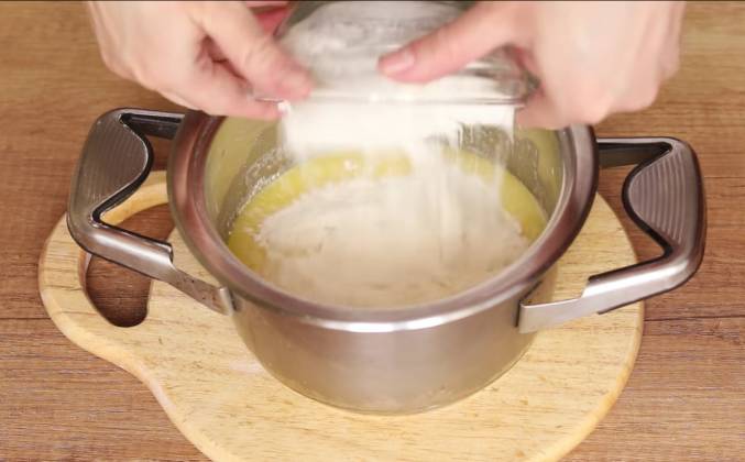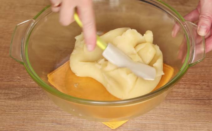 2. В это время в отдельной мисочке смешиваю два яйца. Тесто слегка остыло, оно теплое. Его немного перемешиваю и понемногу, по чуть-чуть ввожу яйца. Влила и сразу хорошо размешиваю. Тесто густое, добавляю ещё. Перемешиваю и вижу, что тесто ещё не достигло необходимой консистенции. Добавляю ещё одно яйцо. Вливайте его постепенно, может потребоваться половинка или целое яйцо. В итоге мне потребовалось 3 средних яйца. Вот такое должно быть тесто. Оно должно очень медленно стекать с лопатки и образовывать так называемый треугольник.