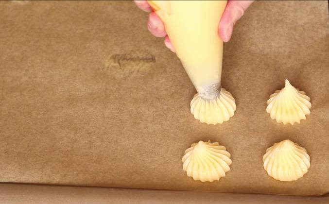 3. Далее нам потребуется мешок и насадка. Перекладываю тесто в кондитерский мешок. Если у вас нет мешка и насадки, можно просто выложить тесто ложками на противень. Отсаживаю печенье на противень, застеленный бумагой для выпечки. Диаметр моего печенья 3-4 сантиметра. Выпекаю печенье в заранее разогретой до 200 C духовке минут 15. а затем уменьшаю температуру до 170 C и выпекаю ещё 20 минут. Печенье достаю и посыпаю сахарной пудрой.Видео рецепт ютуб ниже 👇