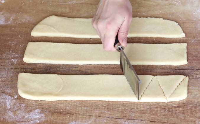 3. Третий и последний раз присыпаю сахаром, складываю, прокатываю и снова складываю. Теперь раскатываю тесто в прямоугольник толщиной около 8мм. Разрезаю вдоль на 3 равные части. Разрезаю на треугольники. Это можно сделать любым ножом, как фигурным так и обычным. Печенье перекладываю на противень и отправляю в разогретую до 200C духовку на 15-20мин. Достаю, остужаю и посыпаю сахарной пудрой.Видео рецепт ютуб ниже 👇