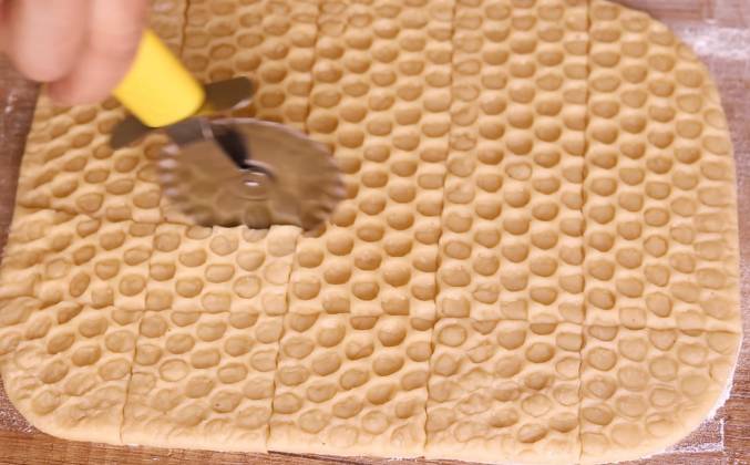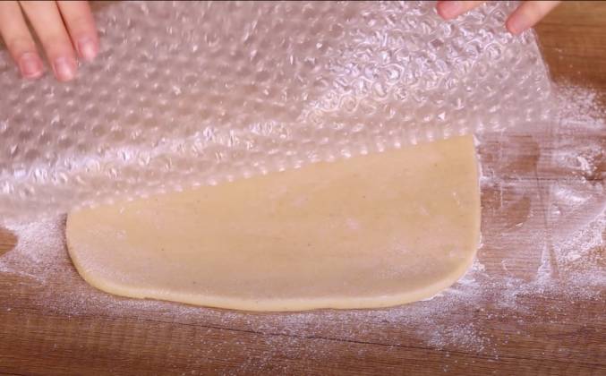 3.  Это я делаю обычно шпателем, но можно сделать широким ножом. Сверху немного присыпаем мукой. Для узора буду использовать вот такую пузырьковую плёнку. Кладу её сверху и прокатываю скалкой, нажимая с небольшим усилием. Аккуратно снимаю пленку и опять немного подравниваю края. Разрезаю на прямоугольники. Выкладываю на противень и отправляю в разогретую до 180°C духовку на 15 минут.Видео рецепт ютуб ниже 👇