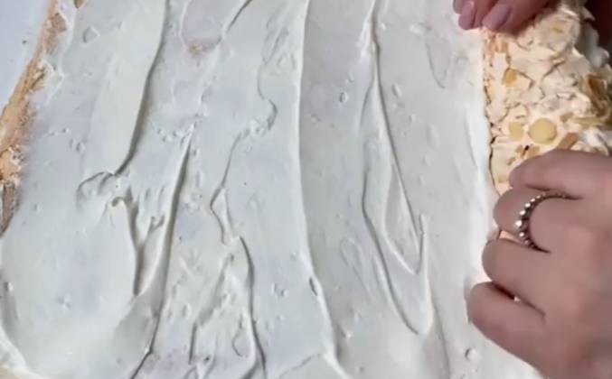 4. Далее достаём из духовки меренговый корж, даём остыть, потом только отделяем его от пергамента. Промазываем тонким слоем крема. Сворачиваем в рулет. Ставим чайник. Приятного аппетита. Готовьте с любовью!Видео рецепт ниже 👇