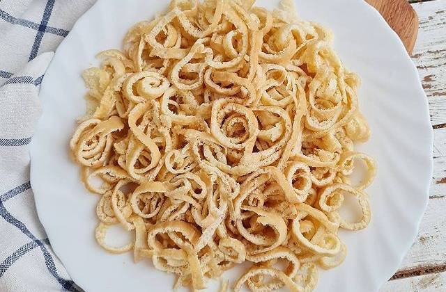 2. Из каждого яйца по отдельности испечь яичные блинчики, разболтав яйцо с щепоткой крахмала. Жарить быстро на слегка смазанной сковороде. Как схватился, перевернуть на другую сторону. Снять, свернуть горячим в трубочку. Так проделать с каждым яйцом. Остудить, тонко нарезать трубочку поперёк.