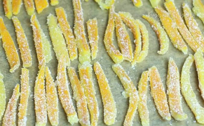 3. Теперь цукаты нужно обвалять в сахарном песке и оставить сушиться. Сушить можно при комнатной температуре или в духовке при температуре 50-70 градусов. Вот такие красивые и вкусные получились цукаты.Видео рецепт ютуб ниже 👇