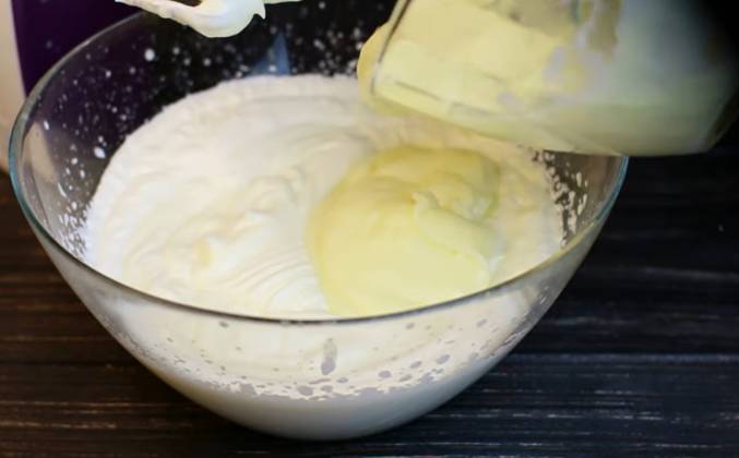 3. Добавить к этой смеси 100 миллилитров холодного молока и 40 грамм кукурузного крахмала. Хорошо перемешать. 30 грамм желатина необходимо залить 100 миллилитрами холодного молока и дать ему набухнуть. При интенсивном перемешивании влить в яичную смесь горячее молоко. Перелить яично-молочную смесь обратно в кастрюлю, добавить набухший желатин. Поставить на плиту и при постоянном помешивании довести смесь до загущения. Перелить заварную основу в миску, накрыть плёнкой в контакт и дать остыть до комнатной температуры. 300 миллилитров очень холодных сливок жирностью 33 % взбить с сахарной пудрой (70 г) до устойчивых пиков.