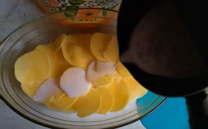 2.  В этом нам поможет терка мандолина. Вообще вещь на кухне очень нужная. С ней вы можете тонко нарезать не только картофель, и ваши запеканки на вид и вкус станут, как произведение искусства. У меня мандолина самая простая и недорогая, но её помощь неоценима. Посмотрите какие тонкие ломтики картофеля у нас получаются! Кроме того с мандолиной нарезать весь картофель выходит очень быстро. Картофель нарезам, и теперь нужно поместить его в холодную воду. В идеале нужно вымочить картофель 20-30 минут, чтобы вышел лишний крахмал.