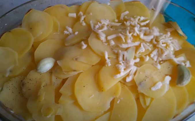 3.  Но если времени нет, то промойте картофель под проточной холодной водой до тех пор, пока с него не потечет прозрачная вода. Легче всего промыть картофель в дуршлаге. Твердый сыр натрите на крупной терке. Я картофель замачивала и сейчас откинула его через дуршлаг. Теперь выкладываем в форму ингредиенты. Форму смазывать не нужно. Сначала выкладываем картофель. Очень тонко выкладывать не стоит, можно 2-3 слоя. Поливаем картофель частью молока. Вы можете перед этим вытащить из молока чеснок. Я же обычно его оставляю. Посыпаем картофель частью сыра. Нужно закрыть всю поверхность картофеля. Далее повторяем слои до заполнения формы. Последний слой картофеля поливаем остатками молока, но не посыпаем сыром.