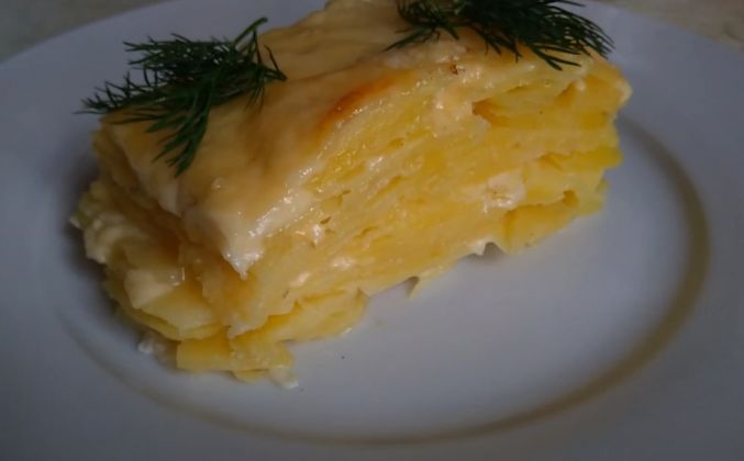 4.  Закрываем форму крышкой или плотно заворачиваем в фольгу и запекаем гратен 20 минут при 180 градусах. Готовый гратен достаем из духовки и щедро посыпаем сыром. Отправляем форму снова в духовку на 5 минут для расплавления и подрумянивания сыра. Форму закрывать уже не нужно. Достаем гратен из духовки и даём ему постоять 5-7 минут. За это время он не успеет сильно остыть, но не будет разваливаться при выкладке на тарелку. Посмотрите какой красивый и нежный гратен у нас получился! А эти тонкие ломтики картофеля просто замечательны! Аромат потрясающий! Перед подачей посыпьте гратен вашей любимой зеленью.Видео рецепт ютуб ниже 👇