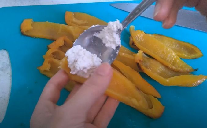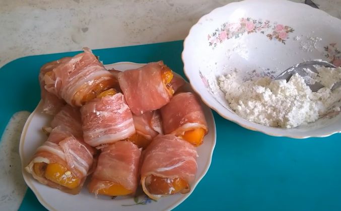 2.  Болгарский перец достаем из духовки. От него нужно отделить семена и плодоножку. Разрезаем перец вдоль и аккуратно всё вычищаем. Перец порежем на полосы средней ширины. Из него нам нужно сделать рулеты. Немного творога положите на край полоски из перца и заверните в рулет. То же самое проделайте с остальным перцем и творогом. Полоски копченого бекона сложите вдоль пополам, если они слишком широкие, как у меня. Заверните рулеты из перца с творогом в бекон так, чтобы он с перцем был крест на крест, чтобы не выплыл творог.