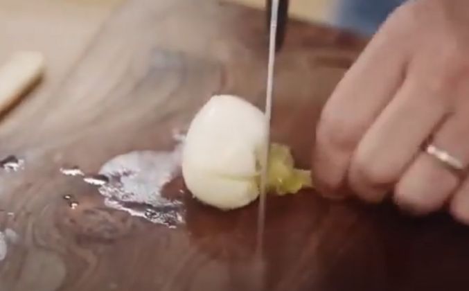 3. Так давайте откроем. Либо ножом, либо ножницами. Отрезаем кончик. Можете положить сюда травы, чили, трюфели, ароматизированное сливочное масло.
