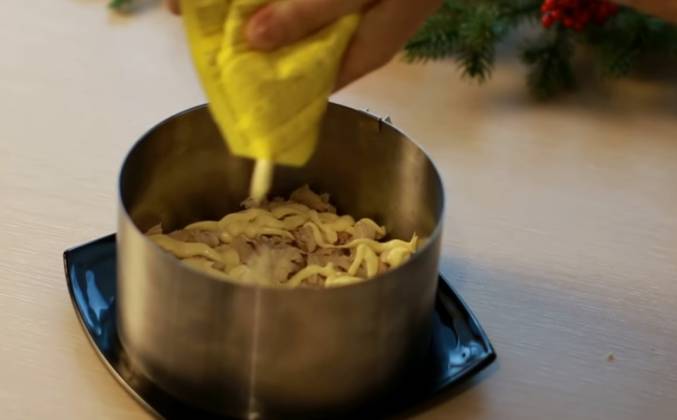 2. Отжимаем лишний сок и выкладываем в кулинарное кольцо поверх курицы, добавляем майонез. Натираем на крупной терке 3 вареных яйца, выкладываем в кулинарное кольцо поверх огурцов.