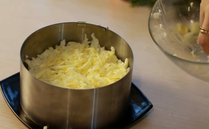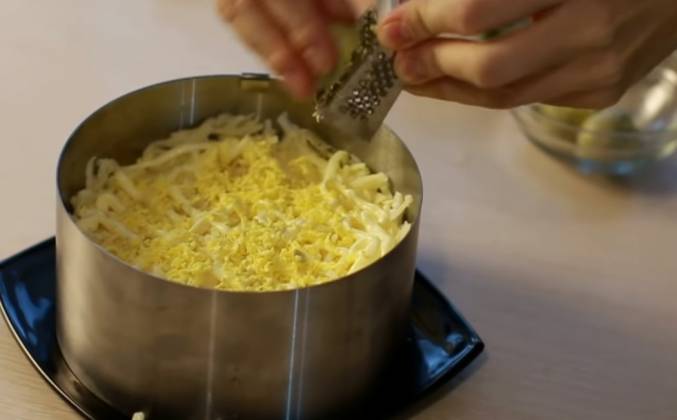 3. Натираем на крупной тёрке 150 грамм твердого сыра. Выкладываем сыр, добавляем майонез и на мелкой терке натираем яичные желтки. Сверху украшаем зеленью.Видео рецепт ютуб ниже 👇