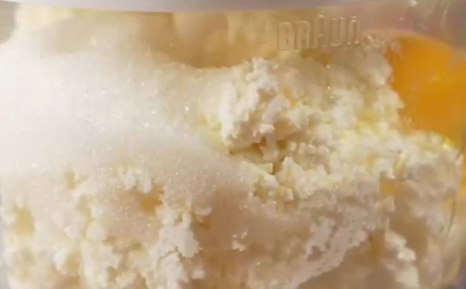 2. Начинка. 100 г изюма моем и заливаем кипятком. Оставляем на 10 мин. Затем изюм обсушиваем бумажными полотенцами. В измельчитель кладем 500 г творога, 2 яйца, 4 ст.л. сахара, 10 г ванильного сахара. Блин смазываем начинкой и посыпаем изюмом. Ссворачиваем в рулет. Таким методом начиняем все блины. Начиненные блины разрезаем пополам. Форму для выпечки смазываем сливочным маслом. Размер моей формы 24 * 32 см. В форму выкладываем начиненные половинки блинов рядами.