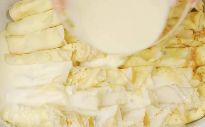 3. Каждый последующий ряд кладем на предыдущий. Готовим заливку для блинов. В миску наливаем 200 мл сливок, разбиваем 1 яйцо и насыпаем 2 ст.л. сахара. Все перемешиваем венчиком до однородности. Я использую сливки 33% жирности, но можно взять и менее жирные. Приготовленную заливку выливаем на блины. Форму накрываем фольгой. Ставим в духовку разогретую до 180 градусов и запекаем примерно 30 минут. Спустя 30 минут снимаем фольгу и печем еще 10 минут, чтоб блины подрумянились. Готовое блюдо достаем из духовки.Видео рецепт ниже 👇