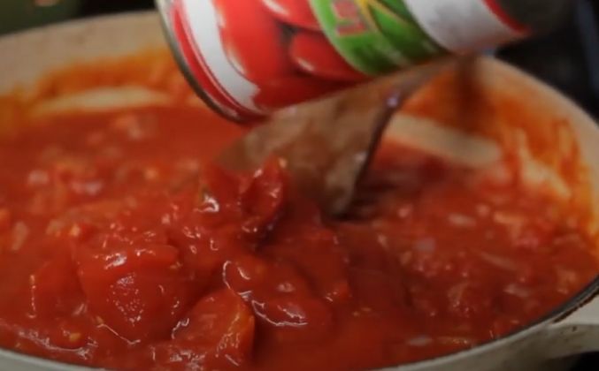 2. Да. Убедитесь, что они порезаны. Мама показала нам, как это делается. Просто избавляет от необходимости вытаскивать их, резать и приводить в порядок. Что? Да Только посмотрите на это! Потому что там много жидкости. Мы так же добавим концентрированный бульон. Покрошите бульон, пусть он растворится. Поверь мне, это делает свою работу. Это действительно так. Там есть большие куски помидоров. Просто раздавите их ложкой. Теперь добавьте соль и перец. Для этого не достаточно пеперончино или просто перца. Не достаточно, чтобы сделать его острым и пряным. Но это должно просто дать ему немного тепла. Это классическая томатная сальса. Я просто хочу немного попробовать. Оставьте его кипятить на медленном огне около 15 минут. За то же время приготовится ваша паста.