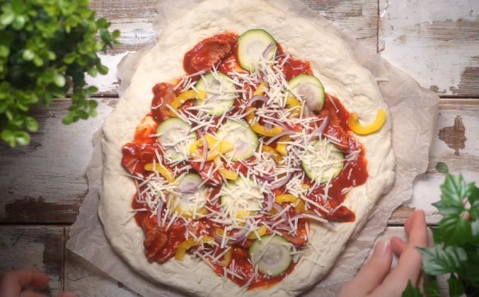 2. На тесто для пиццы выложить «говядину» в соусе, равномерно распределить. Выложить на пиццу нарезанный тонкими колечками цуккини, сладкий перец, красный лук.