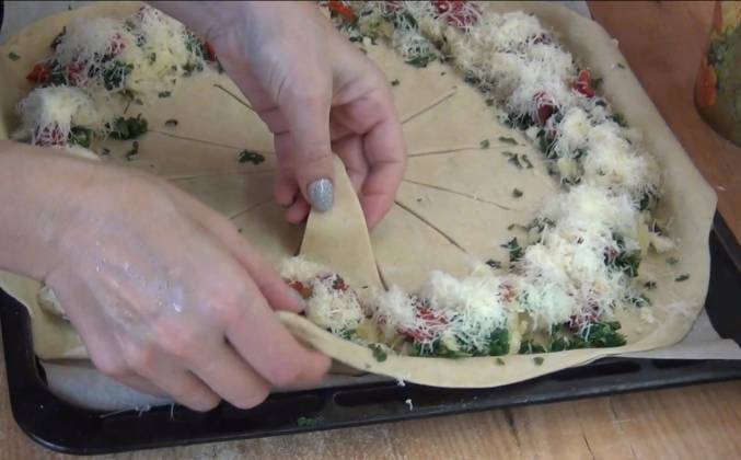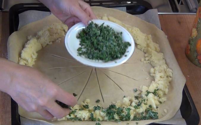 2. Делим тесто пополам, чтобы приготовить два пирога. Раскатываем тесто тонко, как на пиццу. Раскатываем тесто в тонкий круг. Переносим тесто на противень, застеленный пергаментной бумагой, при помощи скалки. Будем формировать венок прямо на противне. Тесто эластичное и не рвётся. Делаем радиальные разрезы от центра. Разрезаем не до конца. Выкладываем по кругу картофель. Выравниваем руками. Сверху посыпаем петрушкой или укропом. Можно использовать свежезамороженную или свежую зелень. Сверху выкладываем нарезанный перец.