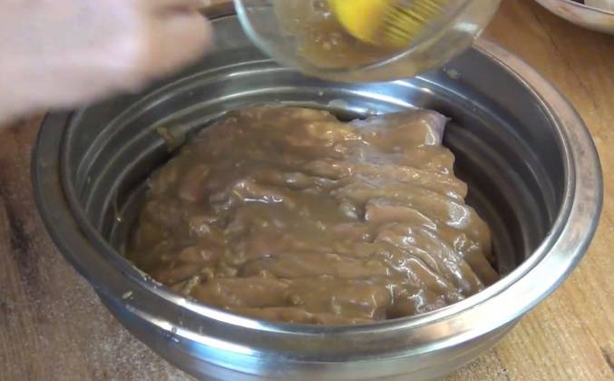 2. Обильно смазываем каждый ломтик мяса маринадом. Это удобно делать в миске. Оставляем мясо на два-три часа при комнатной температуре. Нарезаем морковь кружочками, а грибы платинками. На противень выкладываем фольгу в три слоя. Два слоя будут снизу, один - сверху. Кладём мясо на фольгу. В каждый разрез на мясе кладём кусочек сыра, морковку и грибочки. Сыра можно положить больше. Выравниваем гармошку. Аккуратно заворачиваем мясо в фольгу. Готово! Ставим мясо в разогретую до 190-200°C/370-390°F.