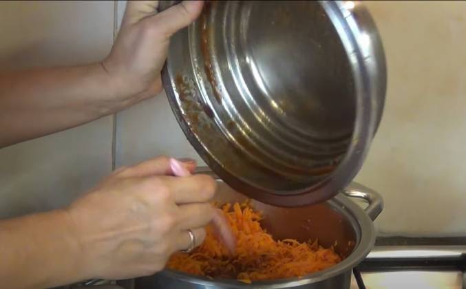 2. Морковь не должна быть сухой. Я добавлю ещё водички. Перемешиваем. Накрываем крышкой и тушим до мягкости моркови. Лук уже приготовился. Морковь тоже готова, если она мягкая. Можно попробовать. Если не хрустит, значит морковь готова. Отключаем нагрев. Перекладываем лук к моркови. Добавляем соль. Не стесняйтесь, пробуйте: вы же готовите для себя. Перец. Лавровый лист. Хорошо перемешиваем, чтобы лук соединился с морковкой. Выдавливаем через пресс чеснок. Снова всё хорошо перемешиваем.
