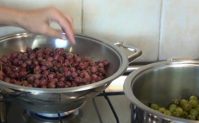 Конфитюр из крыжовника из зеленого и красного крыховника. Помните как к/ф "Женитьба Бальзаминова"? Вы какие ягоды лучше любите? А Вы какие? Я - клубнику со сливками. А я - крыжовник. Ну как же можно? Он же колется! Вот и я - больше люблю крыжовник. Когда на даче его очень много созревает - готовлю из него варенье или конфитюр. Вот вчера закрыла баночку конфитюра. Мне показалось, что он немножко жидковат. Сегодня у меня зелёный и красный крыжовник. Для конфитюра я буду использовать яблочный пектин, чтобы конфитюр получился желеобразным. Для рецепта нам понадобятся: крыжовник, сахар, вода и пектин. Берём вымытый крыжовник. Хвостики и веточки удалять не надо. Конфитюр готовится просто. .
