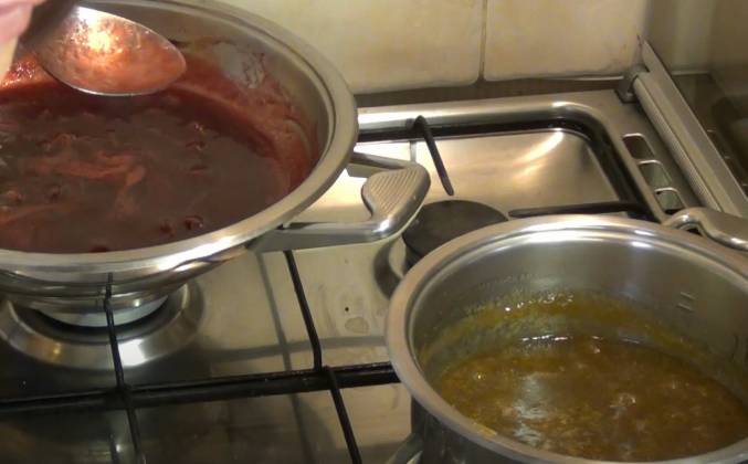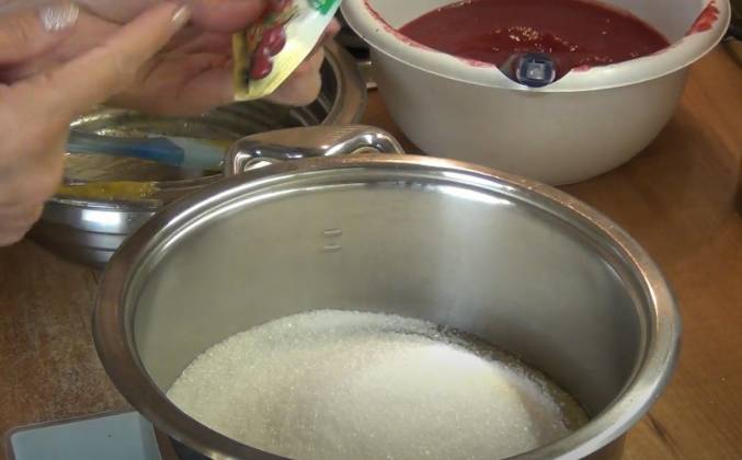 2. Посмотрим, сколько получилось крыжовникового пюре. Перекладываем пюре в кастрюлю. У меня было 1,1 кг зелёного крыжовника. Пюре получилось 400 г. Добавляем сюда столько же сахара - 400 г. На 1 кг ягоды нужно добавить 20 г пектина. На 400 г ягоды добавляем примерно 8 г пектина. Хорошо перемешиваем. Ставим на огонь вариться. Ту же процедуру проделываем и с красным крыжовником. Закипевшую смесь провариваем 5 минут, помешивая. Отключаем нагрев. Красный крыжовник покипит ещё пару минут.