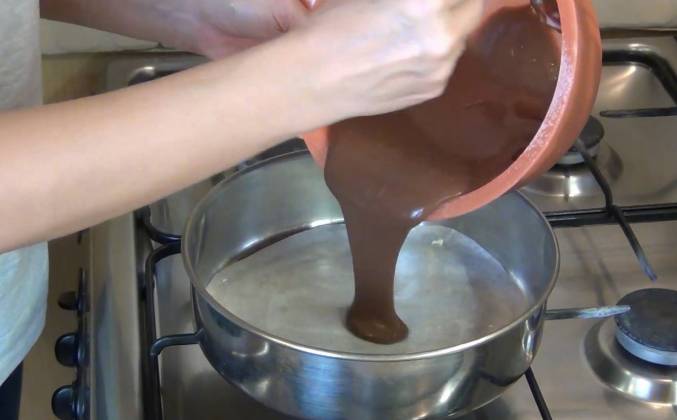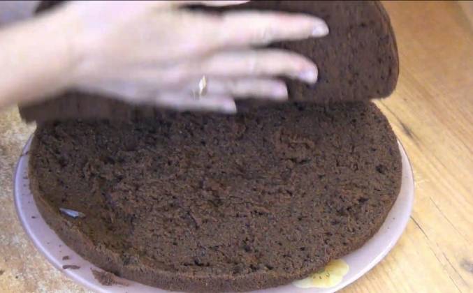 2.  Переливаем тесто в форму для выпечки, используя лопатку. Как жидкий шоколад. Ставим бисквит выпекаться в разогретую до 170°С / 340°F духовку. Через 40 минут проверяем готовность бисквита при помощи деревянной палочки. Проткнули - палочка осталась сухая, значит бисквит готов. Оставляем его остывать. Срезаем у бисквита верх. Разрезаем бисквит вдоль на 2 части. Если взять форму для выпечки диаметром 20 см, то бисквит получится выше. Он мягкий и плотный. В то же время, он пористый и красивый.