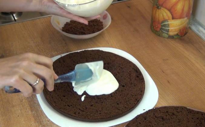 2.  Переливаем тесто в форму для выпечки, используя лопатку. Как жидкий шоколад. Ставим бисквит выпекаться в разогретую до 170°С / 340°F духовку. Через 40 минут проверяем готовность бисквита при помощи деревянной палочки. Проткнули - палочка осталась сухая, значит бисквит готов. Оставляем его остывать. Срезаем у бисквита верх. Разрезаем бисквит вдоль на 2 части. Если взять форму для выпечки диаметром 20 см, то бисквит получится выше. Он мягкий и плотный. В то же время, он пористый и красивый. 3.  Теперь приготовим крем. Это самый простой сметанный крем. У меня сметана 20% жирности, купила в магазине. В рецепте можно использовать домашнюю сметану. Добавляем сахарную пудру. Смешиваем. Измельчаем срезанный у бисквита верх, чтобы получилась бисквитная крошка. Собираем торт! Обильно смазываем кремом первый корж. Оставшимся кремом смажем второй корж. Сверху торт посыпаем бисквитной крошкой. Торт можно украсить измельчёнными орехами, тёртым шоколадом или фруктами.