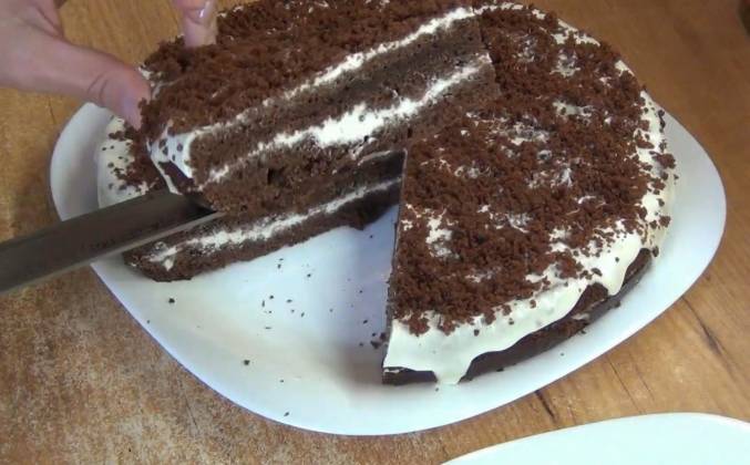 3.  Теперь приготовим крем. Это самый простой сметанный крем. У меня сметана 20% жирности, купила в магазине. В рецепте можно использовать домашнюю сметану. Добавляем сахарную пудру. Смешиваем. Измельчаем срезанный у бисквита верх, чтобы получилась бисквитная крошка. Собираем торт! Обильно смазываем кремом первый корж. Оставшимся кремом смажем второй корж. Сверху торт посыпаем бисквитной крошкой. Торт можно украсить измельчёнными орехами, тёртым шоколадом или фруктами. 4.  У меня торт простоял всю ночь в холодильнике. Чтобы хорошо пропитаться, торту достаточно 3-4 часов. Давайте посмотрим, какой торт в разрезе. Торт режется легко, мягко. Всё-таки хочу его попробовать. Торт хорошо пропитался. Он получился нежным, мягким и вкусным. Готовьте с удовольствием и приятного вам аппетита!