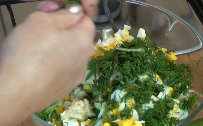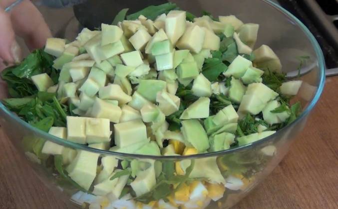 Салат с авокадо и огурцом. Авокадо отлично подходит для приготовления салатов. Этот фрукт идеально сочетается самыми разными ингредиентами. Давайте пополню свою кулинарную копилку салатом из авокадо. Для рецепта мы возьмем: авокадо, огурцы, вареные яйца, чеснок, зелень (может быть любая; у меня сегодня укроп и руккола). соль и перец по вкусу. Заправлять салат буду сметаной.